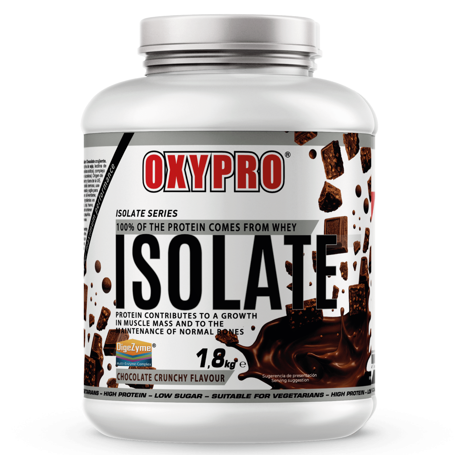 Ingredientes Sabor Chocolate Crunchy: Aislado de proteína de suero (leche), emulgente (lecitina de soja, lecitina de girasol), inulina, cacao en polvo reducido en grasa (2 %), aroma, espesante (carboximetilcelulosa sódica), complejo enzimático DigeZyme® (alfa amilasa, proteasa neutra, celulosa, lactasa, lipasa), edulcorante (sucralosa).