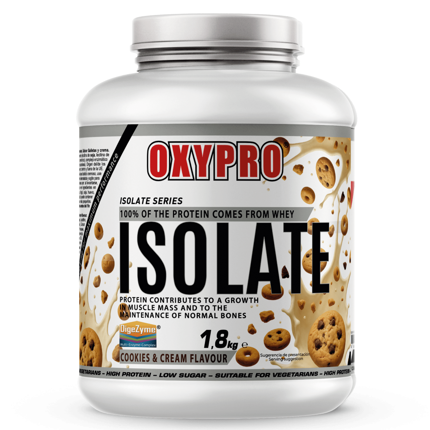 Ingredientes Sabor Cookies & Cream: Aislado de proteína de suero (leche), emulsionante (lecitina de soja, lecitina de girasol), inulina, aroma, espesante (carboximetilcelulosa sódica), colorante (caramelo amónico), complejo enzimático DigeZyme® (alfa-amilasa, proteasa neutra, celulosa, lactasa, lipasa), edulcorante (sucralosa).