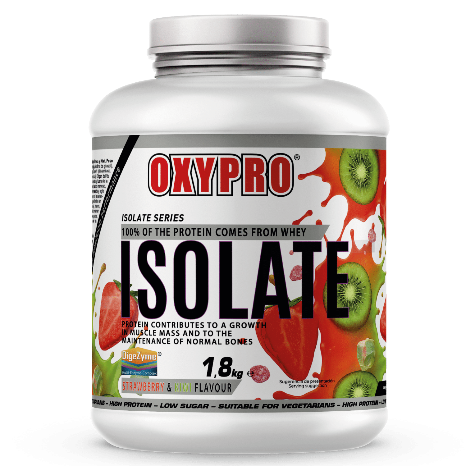 Ingredientes Sabor Strawberry & Banana: Aislado de proteína de suero (leche), emulsionante (lecitina de soja, lecitina de girasol), inulina, aroma (sulfitos), espesante (carboximetilcelulosa sódica), complejo enzimático DigeZyme® (alfa amilasa, proteasa neutra, celulosa, lactasa, lipasa), colorante (polvo de remolacha), edulcorante (sucralosa).